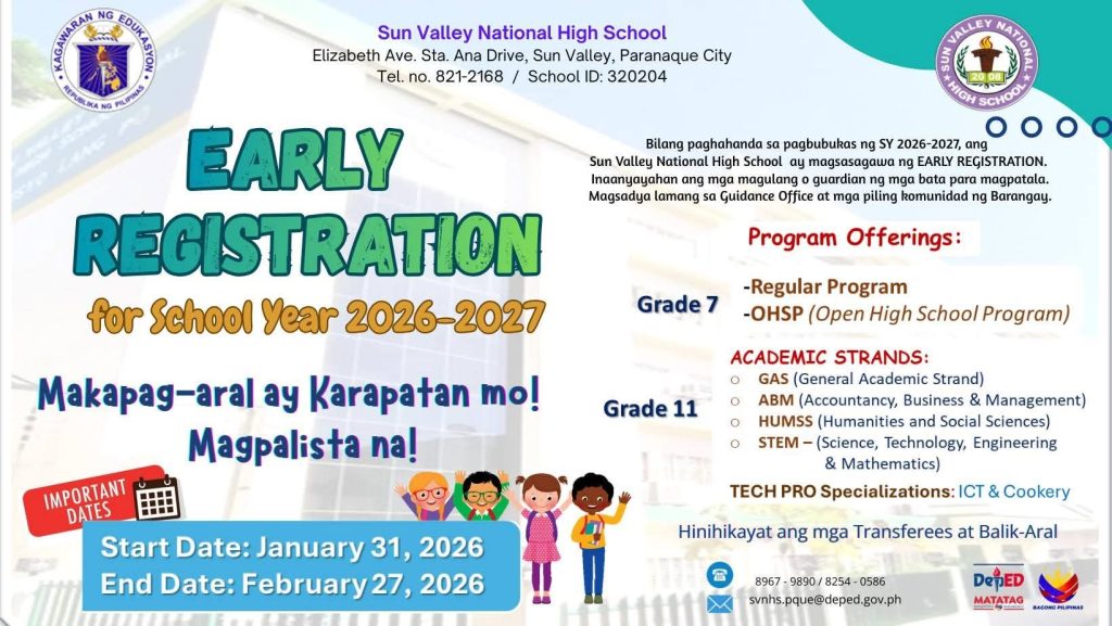 Calling ALL Incoming Grade 7 and Grade 11 learners. Early Registration for SY 2024-2025 starts on January 27 (Saturday) and will end on February 23, 2024.Read More »